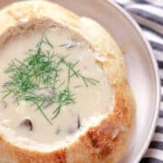 Once your loaf is the shape of a bowl, fill with your favorite soup and serve! You can use the top crust as a lid if you wish.